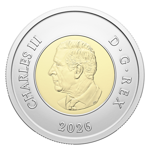 Designed by Canadian illustrator Carl Wiens, the coin’s reverse commemorates the 50th anniversary (“50 YEARS ANS”) of the official opening of the CN Tower (“LA TOUR CN TOWER”) on June 26, 1976. The inner core features a view of the CN Tower overlooking Lake Ontario and dominating a contemporary downtown Toronto skyline, whose tall skyscrapers tower above an outline of the city’s skyline as it appeared in 1976. Additional silhouettes on the outer ring represent five decades of growth and architectural evolution, with the skyline in 1976 appearing on the left and the 2026 cityscape on the right—a visual record of Toronto’s transformation into a modern, world-class city. The obverse features the effigy of His Majesty King Charles III by Canadian artist Steven Rosati.