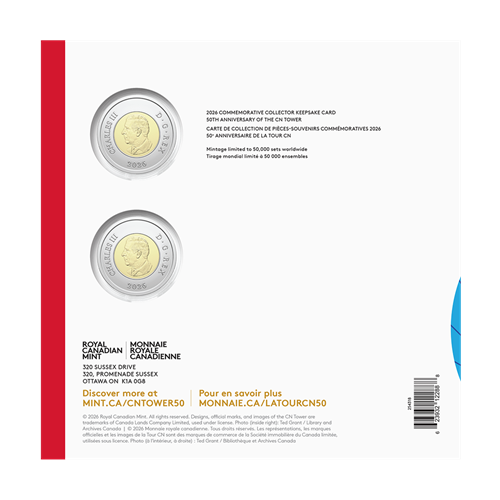With a Commemorative Collector Keepsake Card, you get both versions of the 50th Anniversary of the CN Tower coin—struck and colour with glow—in one complete set! The 2026 $2 commemorative circulation coin celebrates Canada’s tallest freestanding structure on the 50th anniversary of its official opening. The colourized edition is only the second glow-in-the-dark Canadian circulation coin. Both versions, however, showcase the same engraved view of Toronto’s evolving skyline, unmistakably defined by Canada’s National Tower—a world-famous landmark that continues to shine brightly in the hearts and minds of Canadians.