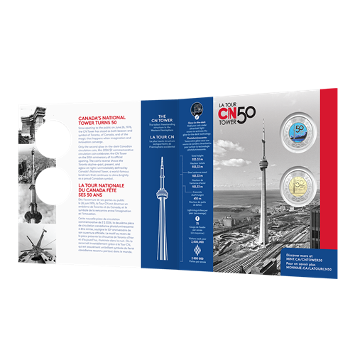 Each Commemorative Collector Keepsake Card contains two (2) uncirculated coins: a struck (engraved only) $2 50th Anniversary of the CN Tower coin, and a colourful glow-in-the-dark version.