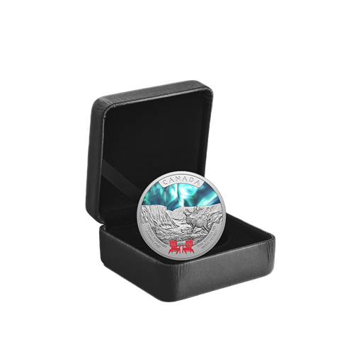 Designed by Nunatsiavut artist Bronson Jacque, your coin’s reverse invites you to take a seat and enjoy the view from Torngat Mountains National Park, located on the northern tip of the Labrador Peninsula. The engraved setting is a U-shaped glacier valley, and the scene depicts a lone caribou lifting its head to the sky as the aurora borealis colourfully lights up the night. Selective colour also highlights two red Adirondack chairs—a familiar sight in Canada’s national parks. The obverse features the effigy of His Majesty King Charles III by Canadian artist Steven Rosati.