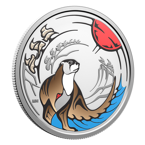 Enhanced with colour, this ¾ oz. 99.99% pure silver coin honours Nigig’s special gifts: the ability to weave play into life’s serious work; and as a bringer of kinship, to keep hearts open and communities whole.