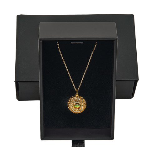 Your Dancing Ammolite – Elements of Nature: Fire Pendant and Chain comes with a travel pouch and a certificate of authenticity, and is presented in a black Royal Canadian Mint-branded set-up box with custom beauty box.