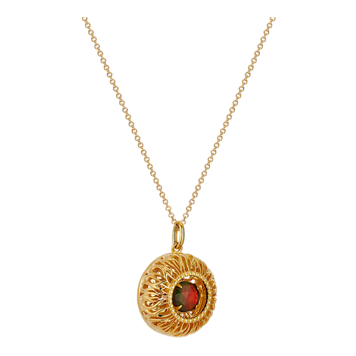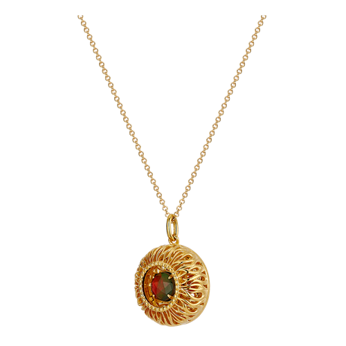 At its heart is a Canadian-mined ammolite, held within an open 3D cage and surrounded by gold‑plated accents, including sculpted flame-lines that echo the flickering movement of fire itself. Cradled within an 18K gold-plated sterling silver pendant with matching chain, the Canadian-mined responsibly‑sourced ammolite moves with you, releasing flashes of red light that suggest a flame glowing from within—an ember of elegance meant to be admired and treasured.