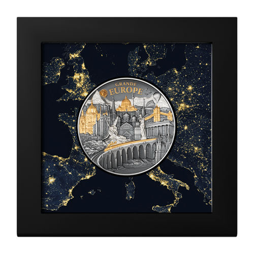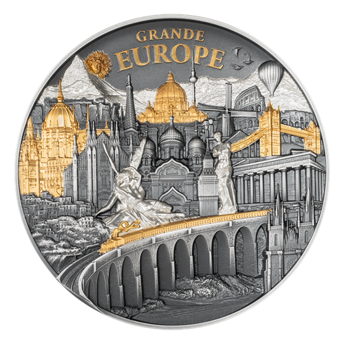 This coin features more than 20 European landmarks, masterfully designed in an antique finish with proof elements and elegant partial gold plating. The interplay of these finishes creates a vivid 3D-effect that draws the viewer’s eye to new details again and again. Gold-plated accents highlight striking elements such as the gleaming domes and bridges, while the antique finish adds depth and texture to the remaining details.