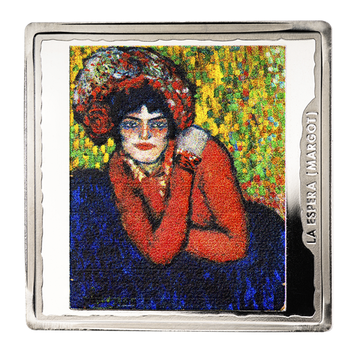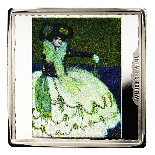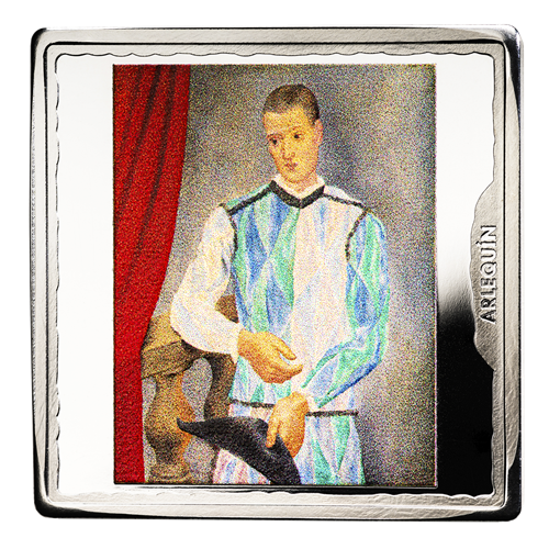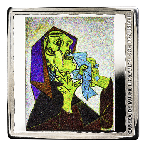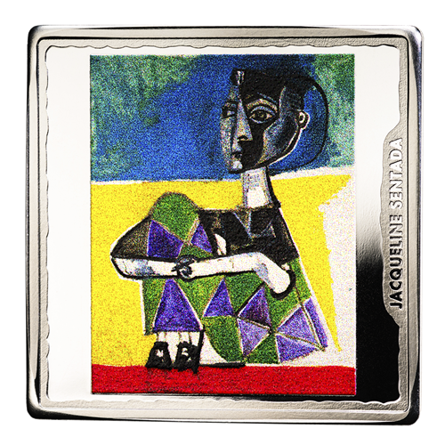 The collection is made up of six square silver coins with a face value of €10, which represent these Picasso masterpieces: “Waiting (Margot)”, “Weeping Woman’s Head with Handkerchief (III)”, “Jacqueline seated”, “Woman in blue”, “Harlequin” and “Bullfight”. The common obverse is also impressive with a portrait of Picasso along with his facsimile signature.