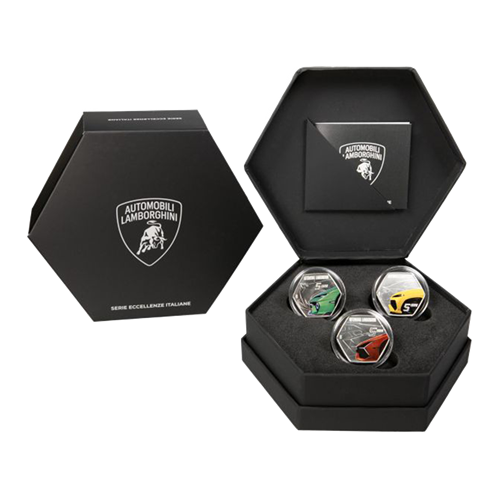 - This set features three coloured sterling silver coins dedicated the legendary Italian car brand Lamborghini.