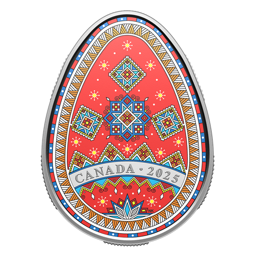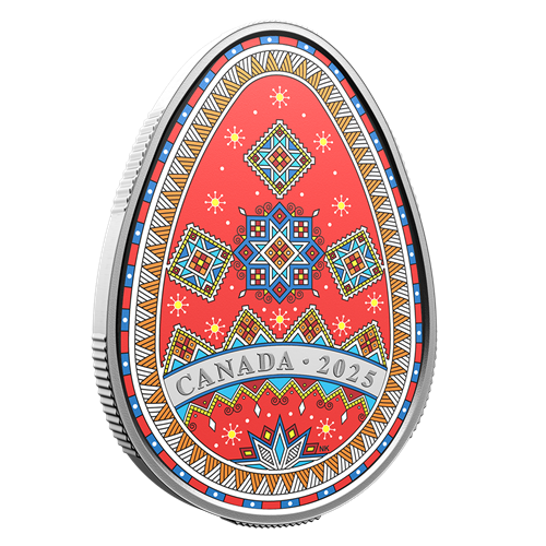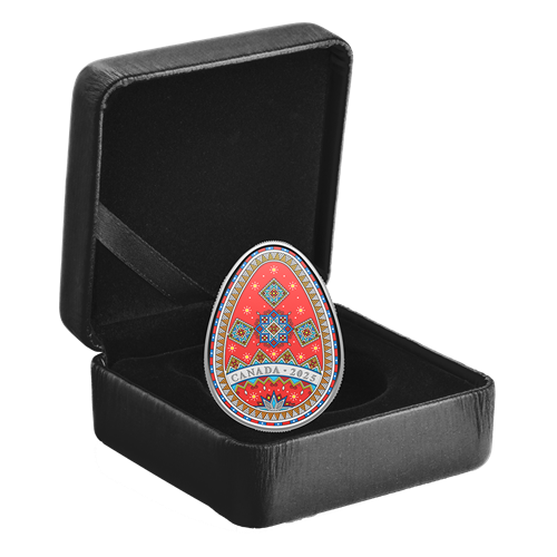 - Colour meets silver. The pysanka design also incorporates glimpses of the coin’s naturally luminous silver surface, weaving sparkling precious metal with vivid colours.