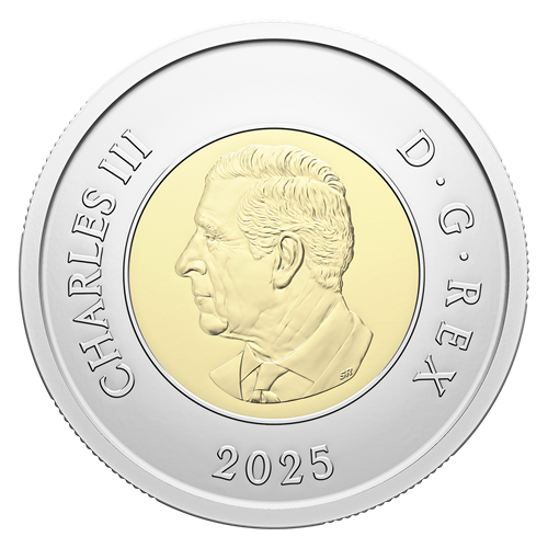 Designed by Canadian artist Tony Bianco, the $1 coin in the 2025 Holiday Gift Card Set shows a polar bear embracing the festive spirit and enjoying some wintry fun. Wearing a toque and scarf, the polar bear holds a gift while skating across the ice on a snowy day. The obverse features the effigy of His Majesty King Charles III by Canadian artist Steven Rosati.