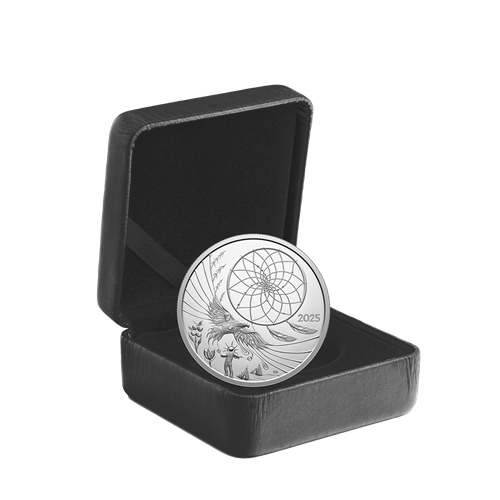 More than a collectible, this 99.99% pure silver coin is a powerful tribute to Ojibwe heritage, brought to life through the artist’s representation of the dreamcatcher tradition. Crafted with deep intentionality, the design focuses on a matriarch—the creator of the dreamcatcher featured here—who is also seen nurturing her child within the form of the soaring Eagle that is a sacred connection to the Creator. From healing florals to wigwams representing community, every engraved element beautifully reflects the Anishinaabe understanding of balance, protection and the interconnectedness of all living things.