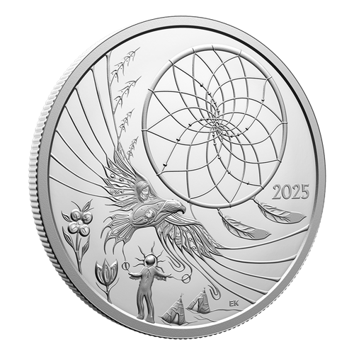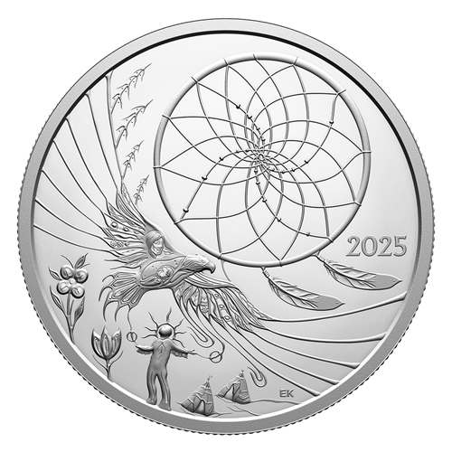 The reverse design by Anishinaabe artist Emily Kewageshig features a representation of the dreamcatcher as a symbol of love and protection, with elements reflecting the Anishinaabe worldview that emphasizes interconnectedness. Surrounded by flowers representing healing and wigwams representing community, a matriarch protects her child through the creation of a dreamcatcher, positioned at the top. She is seen nurturing her child within the form of the Eagle, who carries prayers and messages up to the Creator (Gchi Manidoo) and returns with the gifts of peace and harmony. The obverse features the effigy of His Majesty King Charles III by Canadian artist Steven Rosati.