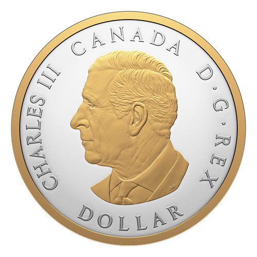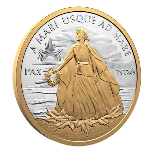 The reverse design by retired Royal Canadian Mint Senior Engraver Susan Taylor features a gold-plated, full-body portrait of Lady Peace, a personification of Peace (“PAX”). Inspired by the allegorical figure atop the National War Memorial in Ottawa, Lady Peace is dressed in a flowing robe and crowned with a wreath of maple leaves and olive branches expressing a core Canadian value of peace. Her serene countenance exudes poise, strength and quiet confidence as she extends her right arm, almost as if the peace wreath she holds is an offering to all. Lady Peace stands on the shoreline, which is similarly plated with yellow gold, and is supported by maple leaves that are symbolic of Canada. Canada’s motto, “A MARI USQUE AD MARE” (“From sea to sea”) appears in the sky above, where the sun’s rays break through the rain clouds and form the shape of a maple leaf. The rim on both sides of the coin is plated with yellow gold, while the obverse features the gold-plated effigy of His Majesty King Charles III by Canadian artist Steven Rosati.