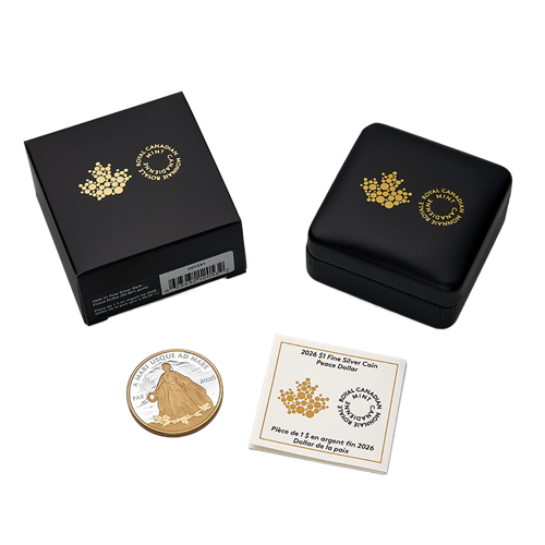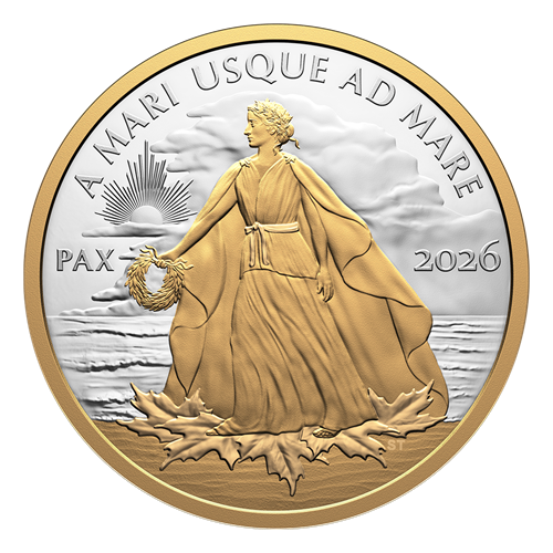 At the heart of Canada’s Peace Dollar stands a graceful personification of Peace that is poised, dignified, and, on the 2026 edition, highlighted by a contrasting precious metal.