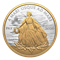 Lady Peace is resplendent in yellow gold plating, which casts a golden light that echoes the quiet power of peace itself. The land beneath her feet, the rim on both sides of the coin, and the effigy on the obverse are also gold-plated.