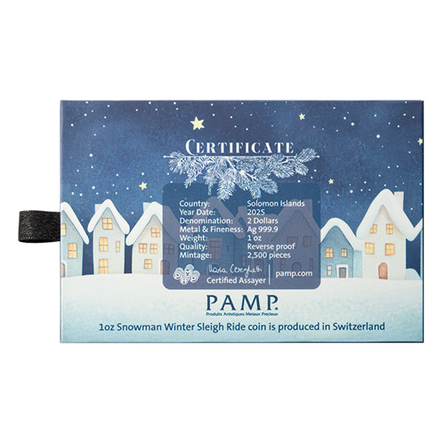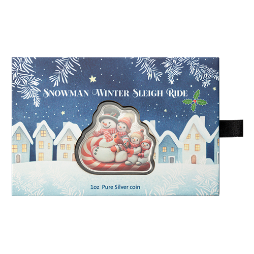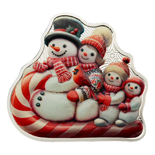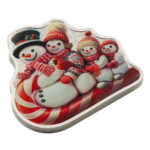 Bring festive cheer to your collection with this vibrant 2025 pure silver coin, featuring full-color artistry of a joyful snowman and a family tobogganing on a candy cane sleigh. Encased in a ready-to-hang ornament capsule, this legal tender coin combines brilliant color with holiday magic for the perfect gift or keepsake.
