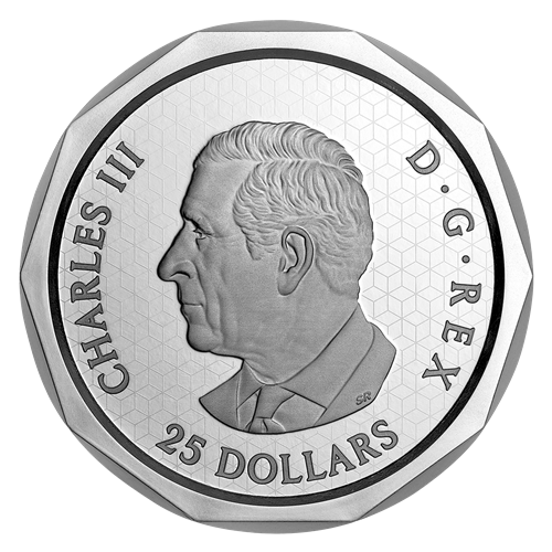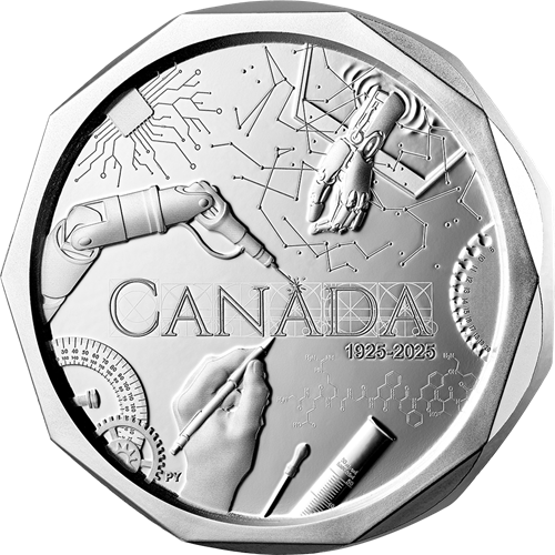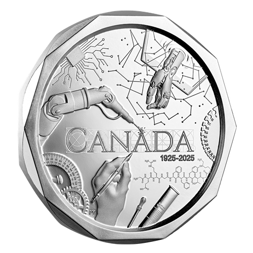 An homage to Canada’s engineers, the reverse design by artist Pandora Young is a representation of a century of engineering innovation and achievements. The diverse field is represented by (clockwise from top): a computer screen with a robotic hand, set against an AI-inspired dot design; a wire gauge; the chemical diagram for insulin partially shown; a test tube and dropper; a hand holding a pencil; a spur gear next to a compass and the tip of a protractor; a soldering iron; and a computer chip. In the centre, the word “CANADA” appears in blueprint lettering, along with the double dates “1925-2025” commemorating the 100th anniversary (“1925-2025”) of the Calling of an Engineer—a rite of passage for Canada’s engineering graduates. The raised rim is uniquely shaped to resemble the Iron Ring worn by Canadian engineers as a symbol of professional obligation. The obverse features the effigy of His Majesty King Charles III by Canadian artist Steven Rosati.