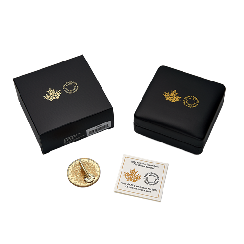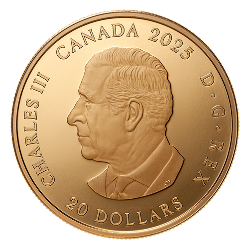 A functional sundial for mid-northern latitudes, your coin’s timekeeping reverse was designed by Canadian artist Anna Bucciarelli. Serving as the base, the reverse is ornamented with acanthus leaves and edged with Roman numerals indicating the hours from 6 a.m. to 6 p.m. At the bottom, a stylized sunflower—a heliotropic flower and a beloved symbol of the sun—supports the gnomon, which harnesses the power of sunlight and casts the measured shadow that helps determine the time of day. The obverse features the effigy of His Majesty King Charles III by Canadian artist Steven Rosati.