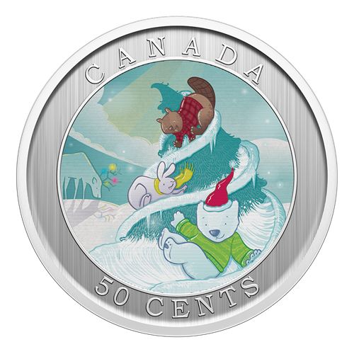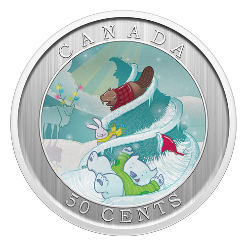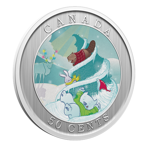 Enhanced with lenticular technology to create the illusion of motion, the coin’s reverse features a joyous and carefree winter scene designed by illustrator Emily Chen. Churchill the polar bear, the Toonie’s ($2 coin) mascot, is seen sliding down and around a tree with two friends – a beaver (top) and a rabbit (middle) – while a caribou grazes in the background. When the coin is tilted, a second image is revealed as the fun intensifies: the beaver is sliding down on his tummy, the rabbit is gliding around the swaying tree, and Churchill’s fast descent has caused him to lose his toque. The obverse features the effigy of His Majesty King Charles III by Canadian artist Steven Rosati.