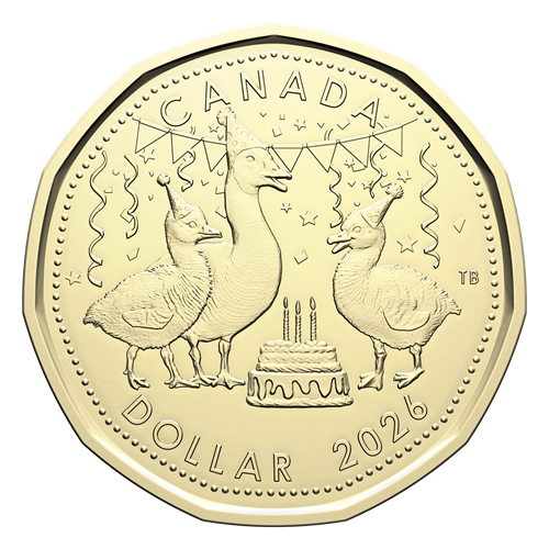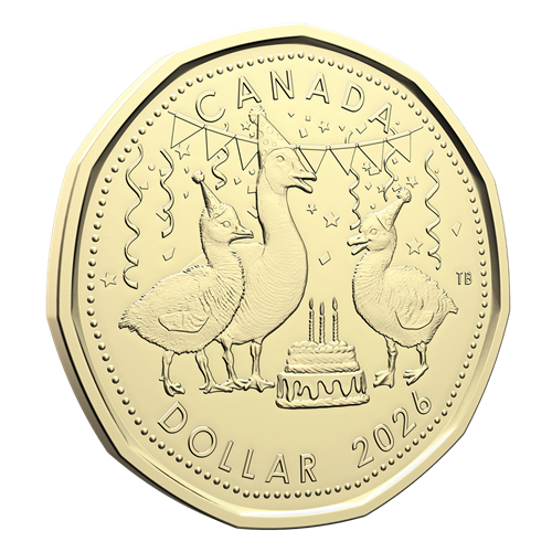 Designed by Canadian artist Tony Bianco, the $1 coin in the 2026 Birthday Gift Card Set strikes a fun, celebratory tone with its image of a gaggle of Canada geese (an adult and two goslings) wearing party hats and gathered around a birthday cake, as confetti falls around them. The obverse features the effigy of His Majesty King Charles III by Canadian artist Steven Rosati.