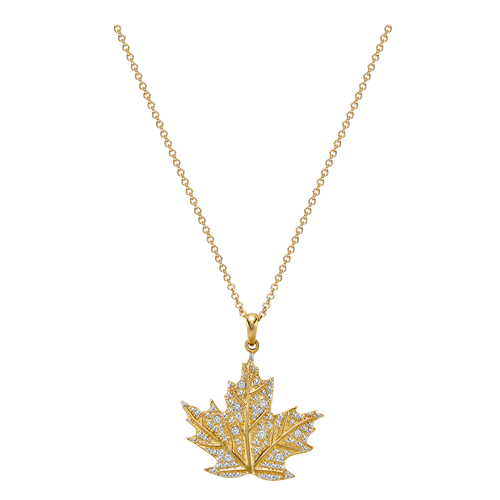 - Dotted with diamonds. Nine round, Canadian-sourced, brilliant cut diamonds (0.15 tcw) are artfully set across the leaf’s lobes, capturing light and adding refined brilliance to every angle.